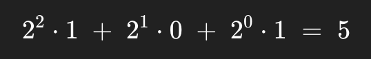 But in computers we don’t have base 10 counting, so we invented binary counting, which is based on 2, not 10. This example will make it more clear. For example, the binary number 101 is equal to: